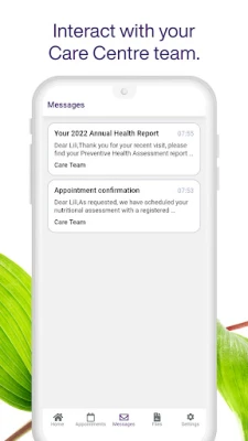 Features include: • Request an appointment • Interact with your Care Centre’s team on a safe messaging platform • Receive and view your health reports safely and easily