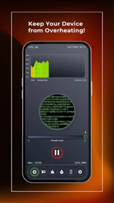 Now a little about how the program works. When you run the check, 1 task per core is launched, running in a circle. When you change the parameters, using the slider, the program stops the current process and starts new ones accordingly, which allows you to monitor the state of productivity. We also use special full protection function and tools for emergency stop of task. Thus, we are sure that with our scanner app in the background process, your device will not be overloaded and will not overheat or burnout even when you turn off the application.