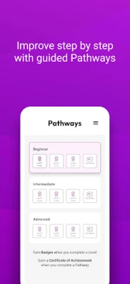 Structured learning tracks designed to help you reach the next step in your English speaking improvement journey. Progress from Beginner -> Intermediate -> Advanced. Earn badges and certificates to show your achievements.