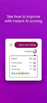 Develop a natural-sounding speaking style by mastering everyday expressions and using them in conversation scenarios. Practice as much as you like without any fear of embarrassment. Receive instant scoring feedback by using our AI-powered scoring technology. Start thinking in English by doing a 3 - 5 minute lesson each day.