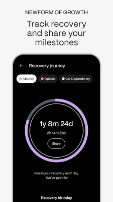 - Track your recovery milestones and celebrate progress with our built-in Recovery Tracker