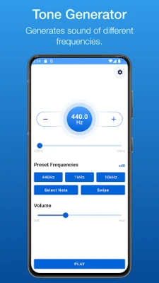 Download Tone Generator for free on your device, utilize the slider to choose the specific frequency, adjust the volume, and hit the Play button.